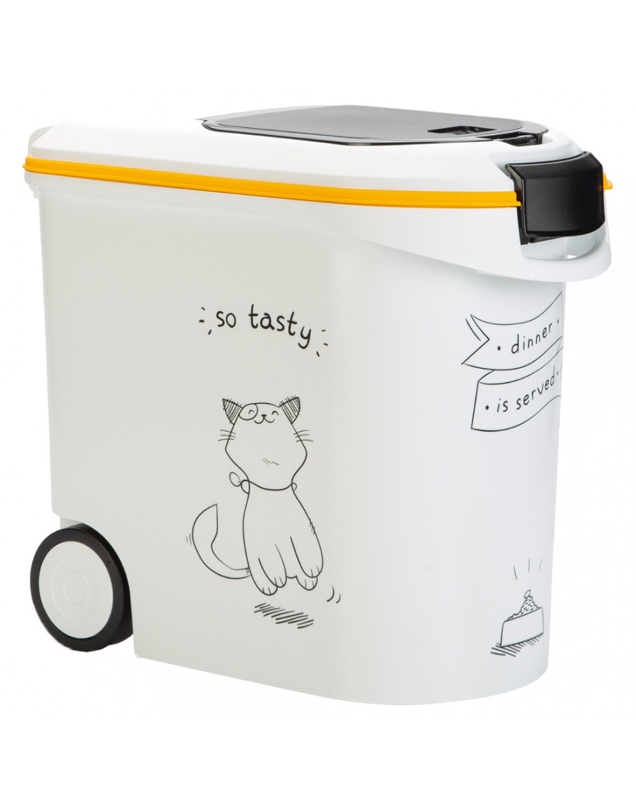 Denna praktiska behållare är en smart plats att förvara din katts mat eller godis och hålla det krispigt och fräscht länge. Behållaren finns i två storlekar. Den större, som rymmer hela 12 kg, är även perfekt för hushåll med flera katter! Mellan behållare och lock finns en lufttät gummitätning. Därigenom hålls maten fräsch och fodrets smaker och aromer bevaras. Locket är utrustat med en separat öppning för enkel exakt dosering av maten varje dag. Smart: du bestämmer själv när katten ska belönas för locket stängs med en säkerhetsstängning som inte heller listiga katter kan öppna för att servera sig själva. Curver Cat Silhouette torrfoderbehållare i överblick: Högkvalitativ torrfoderbehållare för katter Stor kapacitet: perfekt smaker och aromer kan bevaras Med en säkerhetsstängning: så att din favorit inte kan servera sig själv Separat öppning i locket: för exakt dosering Platssparande: tar liten plats i köket eller skafferiet Med dekorativa kattmotiv Färg: vit/grå Material: plast Notera: De olika modellerna har olika funktioner. Se tabellen nedan! Storlekstabell: Innehåll Totala mått Egenskaper 10 l / 4 kg L 19 x B 29,5 x H 35 cm separat lock, praktiskt bärhandtag 35 l / 12 kg L 49 x B 28 x H 42,5 cm separat lock, 2 hjul för enkel transport, säkerhetslock
