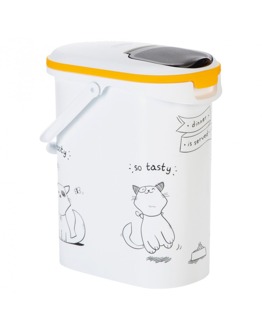 Denna praktiska behållare är en smart plats att förvara din katts mat eller godis och hålla det krispigt och fräscht länge. Behållaren finns i två storlekar. Den större, som rymmer hela 12 kg, är även perfekt för hushåll med flera katter! Mellan behållare och lock finns en lufttät gummitätning. Därigenom hålls maten fräsch och fodrets smaker och aromer bevaras. Locket är utrustat med en separat öppning för enkel exakt dosering av maten varje dag. Smart: du bestämmer själv när katten ska belönas för locket stängs med en säkerhetsstängning som inte heller listiga katter kan öppna för att servera sig själva. Curver Cat Silhouette torrfoderbehållare i överblick: Högkvalitativ torrfoderbehållare för katter Stor kapacitet: perfekt smaker och aromer kan bevaras Med en säkerhetsstängning: så att din favorit inte kan servera sig själv Separat öppning i locket: för exakt dosering Platssparande: tar liten plats i köket eller skafferiet Med dekorativa kattmotiv Färg: vit/grå Material: plast Notera: De olika modellerna har olika funktioner. Se tabellen nedan! Storlekstabell: Innehåll Totala mått Egenskaper 10 l / 4 kg L 19 x B 29,5 x H 35 cm separat lock, praktiskt bärhandtag 35 l / 12 kg L 49 x B 28 x H 42,5 cm separat lock, 2 hjul för enkel transport, säkerhetslock
