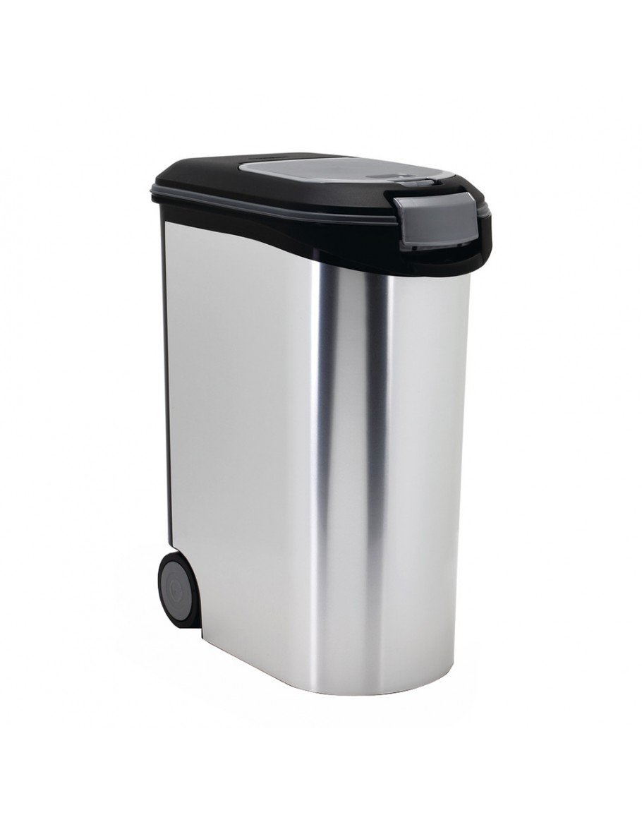 Varje hundägare och djurägare har nog någon gång irriterat sig på stora fodersäckar som står i vägen och dessutom är alltför enkla att "öppna" för hungriga hundar. Curver fodercontainer är ett snyggt och platssparande alternativ till klumpiga foderpåsar! Fodertunnan är perfekt för att lagra stora mängder foder. Den finns i två storlekar och är ett mycket bekvämt tillbehör för dig som utfodrar med torrfoder. En gummitätning i locket förvarat innehållet lufttätt och håller fodret fräscht, krispigt och aptitligt en lång tid. Tunnan har ett separat lock där fodret tas ut för varje måltid. Curver Metallic fodercontainer i överblick: Behållare att förvara torrfoder i för hundar, katter och hästar Robust tilverkad: insidan är tillverkad av robust hårdplast Platssparande och dekorativ förvaring av fodret: inga klumpiga foderpåsar som står i vägen Separat lock: där de dagliga portionerna tas ut Lufttät gummitätning: bevarar alla näringsämnen och fodret hålls fräscht och gott längre Bekväm att handha: integrerad öppning där fodret bekvämt kant tas ut varje måltid Dekorativ metall-look Färg: svart / silver Material: plast Finns i två storlekar Notera: De olika storlekarna har olika funktioner. Se tabellen nedan! Storlekstabell: Innehåll Totala mått Utrustning 23 l / 10 kg L 51 x B 23 x H 50 cm separat öppning i locket, handtag, staplingsbar 54 l / 20 kg L 49 x B 28 x H 60,5 cm separat öppning i locket, hjul och handtag att dra i, säkerhetsstängning, spade i locket