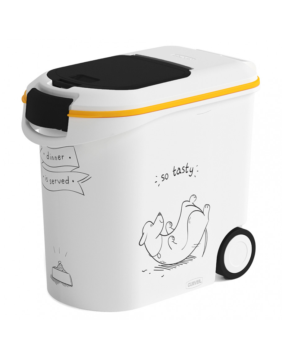 I den snyggt utformade foderbehållaren från Curver lagrar du hundens torrfoder platssparande och slipper ha stora, otympliga foderpåsar stående hemma. Dessutom kan du alltid servera hunden fräscha och krispiga foderbitar, för gummitätningen mellan locket och behållaren stänger den lufttätt och bevarar smaker och aromer. Behållaren är lätthanterlig och praktisk att dosera ur genom en mindre, extra lucka i locket. Locket på de stora behållarna är försett med eb säkerhetsstängning för att hunden inte ska få upp locket och äta i smyg. Curver Silhouette foderbehållare i överblick: Högkvalitativ torrfoderbehållare för en eller flera hundar Med en lufttät gummitätning: smaker och aromer bevaras Enkelt att ta ut foder: ett skjutlock eller separata luckor Med säkerhetsstängning: så att hunden inte ska servera sig själv när den har lust Med hjul: enkel att handha Separat öppning i locket där fodret tas ut för måltiderna Praktisk: idealisk att ta med på semestern Platssparande: för köket eller skafferiet Snygg design med hundsiluetter Färg: vit/grå Material: plast Notera att behållarnas funktioner varierar beroende på storleken. Läs mer nedan i tabellen och se även bilderna. Storlekstabell: Innehåll Totala mått Detaljer 15 l / 6 kg L 52 x B 24 x H 36 cm separat lucka i locket 35 l / 12 kg L 49 x B 28 x H 42,5 cm separat lucka i locket, hjul att dra den med, säkerhetsstängning 54 l / 20 kg L 49 x B 28 x H 60,5 cm separat lucka i locket, hjul att dra den med, säkerhetsstängning