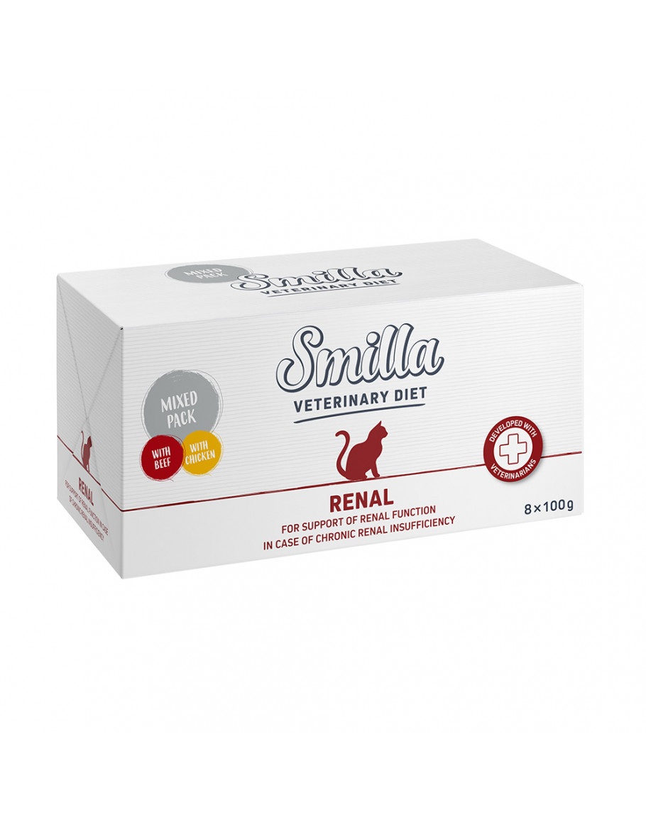 Smilla Veterinary Diet Urinary Smilla Veterinary Diet Urinary är ett komplett dietfoder speciellt utvecklat för katter med tendens till struvitstenar. Struvitstenar orsakas ofta av en koncentration av mineraler i urinen. Detta kan leda till inflammation i urinröret och urinblåsan. Därefter kan urinröret också blockeras hos hankatter, vilket leder till en medicinsk nödsituation. Symtomen är täta urinträngningar i små mängder, ibland med läten eller urinträngningar utanför kattlådan, orenlighet, blodig urin och ett ökat "behov av att rengöra" könsorganen. Det balanserade mineralförhållandet i detta foder gör att pH-värdet i urinen hamnar i ett lätt surt område. Fodrets urinförsurande egenskaper kan bidra till att förhindra att ny struvit bildas. Fodret är spannmålsfritt. Smilla Veterinary Diet Urinary övertygar: Komplett dietfoder för vuxna katter med sjukdomar i de nedre urinvägarna För att minska återfall av struvitstenar Kombination av mineraler: för ett optimalt pH-värde i urinen Kostfiber: bidrar till en balanserad matsmältning och kan hjälpa katten att känna dig mätt Spannmålsfri sammansättning Innehåller inget tillsatt socker, soja eller konstgjorda tillsatser Smilla Veterinary Diet Renal Smilla Veterinary Diet Renal är ett komplett dietfoder för att stödja njurfunktionen hos katter med kronisk njurinsufficiens. Vid njurinsufficiens är njurens nefron oåterkalleligt skadade och de fortfarande intakta nefronen måste ta över funktionen. För att skona dessa är det viktigt att förse kroppen med lågt men mycket högkvalitativt protein. Dessutom är ett lågt fosforinnehåll viktigt. Av denna anledning har protein- och fosforinnehållet i Smilla Veterinary Diet Renal minskats. De animaliska proteinkällor som ingår är dock tillräckliga för att täcka proteinbehovet. Detta foder innehåller också lättsmält potatis som en källa till kolhydrater. Maten är spannmålsfri. Smilla Veterinary Diet Renal är övertygande: Dietfoder för alla vuxna katter med njursjukdom/njurinsufficiens Reducerat protein- och fosforinnehåll för att avlasta njurarna Spannmålsfri sammansättning Med högkvalitativa proteiner för att täcka proteinbehovet Med potatis som en lättsmält kolhydratkälla Utan tillsatt socker Urinary mix-paketet innehåller 12 x med kalkon 12 x med kalvkött Renal mix-paketet innehåller 12 x med kyckling 12 x med nötkött Du hittar mer information om produkterna här: Smilla Veterinary Diet Urinary med kalkon Smilla Veterinary Diet Urinary med kalv Smilla Veterinary Diet Renal med kyckling Smilla Veterinary Diet Renal med nötkött