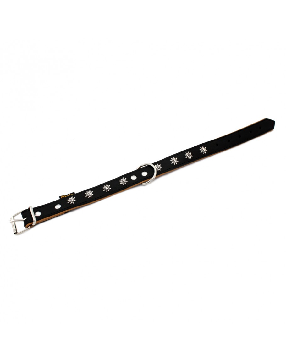 Letar du efter ett halsband i elegant design för din fyrbenta vän, oavsett om det är för speciella tillfällen eller för den dagliga promenaden? Med Heim halsband Edelweiß gör du garanterat rätt val. Läderhalsbandet är ett riktigt blickfång med sin högkvalitativa naturläderlook i svart och de eleganta Edelweiss-nitarna! Halsbandet är tillverkat av kraftigt fettat, vegetabiliskt garvat mjukt nötläder, fodrat med mjukt kalvskinn. Det gör det inte bara extra mjukt och skönt att hålla i, utan även helt hudvänlig för både hund och ägare. Halsbandet är tillverkat i Tyskland och tillhör sortimentet ”Edelweiß” från märket Heim, vilket innebär att det kan kompletteras med ett passande koppel som kan köpas separat. Heim halsband Edelweiß i korthet: Elegant läderhalsband för hundar Smidig kombination av mjukt- och kalvskinn: av nötläder, vegetabiliskt garvat, snygg tvåfärgad look Med snygga Edelweiss-beslag: populär, snygg och enkel design Hudvänligt: kraftigt fettat läder, särskilt mjuk, professionellt bearbetat Made in Germany: högkvalitativ, professionell bearbetning, hög kvalitet Produktlinjen “Edelweiß”: kan kombineras med matchande koppel (säljs separat) Typ av lås: rullspänne Spänne material: förnicklad metall Material: yttermaterial: nötläder fodermaterial: kalvskinn ring och spänne: förnicklat Storlekstabell: Halsomfång Stängt Total längd Total bredd Bredd ovanmaterial Bredd fodermaterial 24 - 29 cm ca 19 - 26 cm 32 cm 20 mm 16 mm 20 mm 28 - 35 cm ca 22 - 32 cm 40 cm 25 mm 20 mm 25 mm 36 - 44 cm ca 33 - 43 cm 50 cm 30 mm 25 mm 30 mm 44 - 54 cm ca 41 - 52 cm 60 cm 30 mm 25 mm 30 mm Observera: Det kraftigt fettade lädret gör denna produkt inte bara smidig, mjuk och greppvänlig, utan även vädertålig. För att behålla dessa egenskaper och det snygga utseendet länge, är det inte så lämpligt för vattenälskande hundar att bada med det på. Det tyska företaget har i över 100 år tillverkat kvalitetsprodukter för husdjur. Högkvalitativa material och robust handarbete garanterar en lång livslängd på alla produkter från Heim.