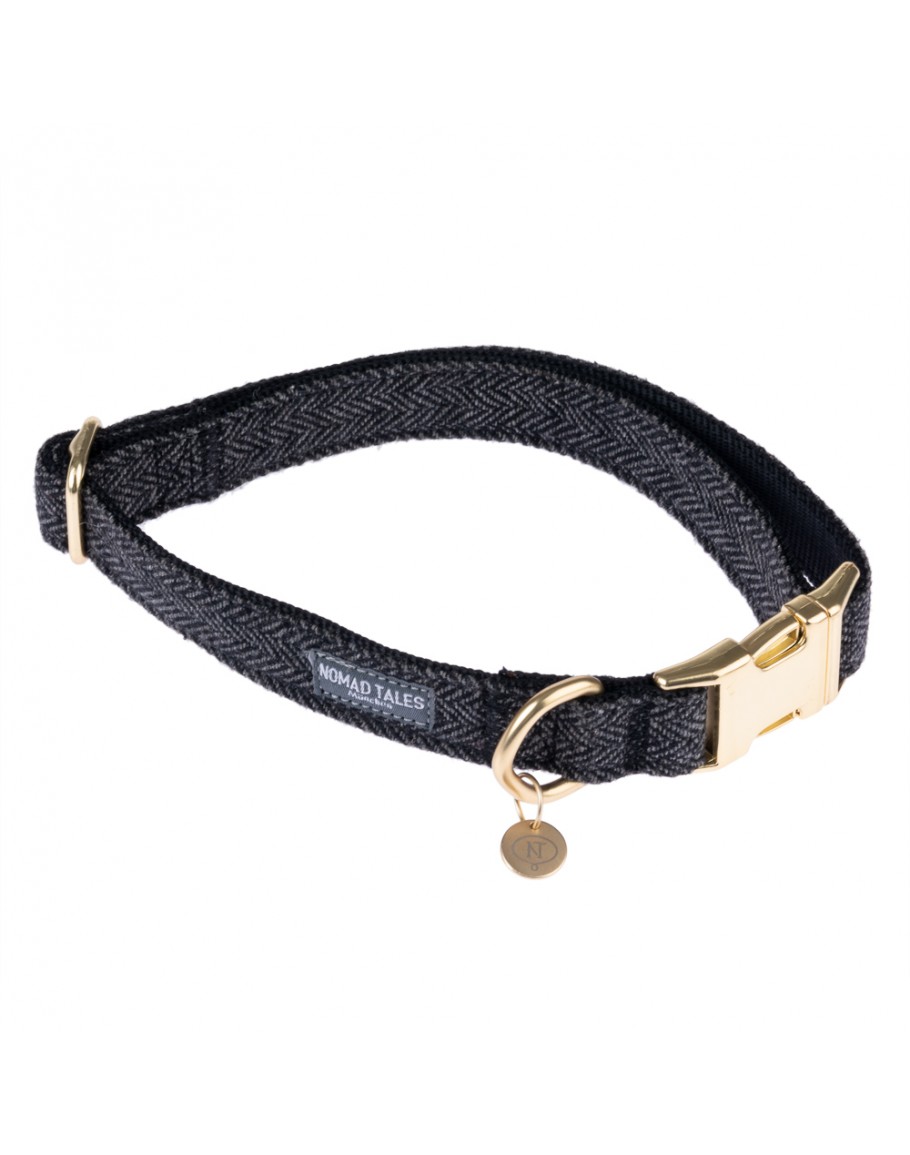 Ovanligt halsband för hundar, stilrent fiskbensmönstrat, eleganta detaljer i matt guldfinish, med stor D-ring, steglöst justerbart för optimal passform, av polyester och nylon
