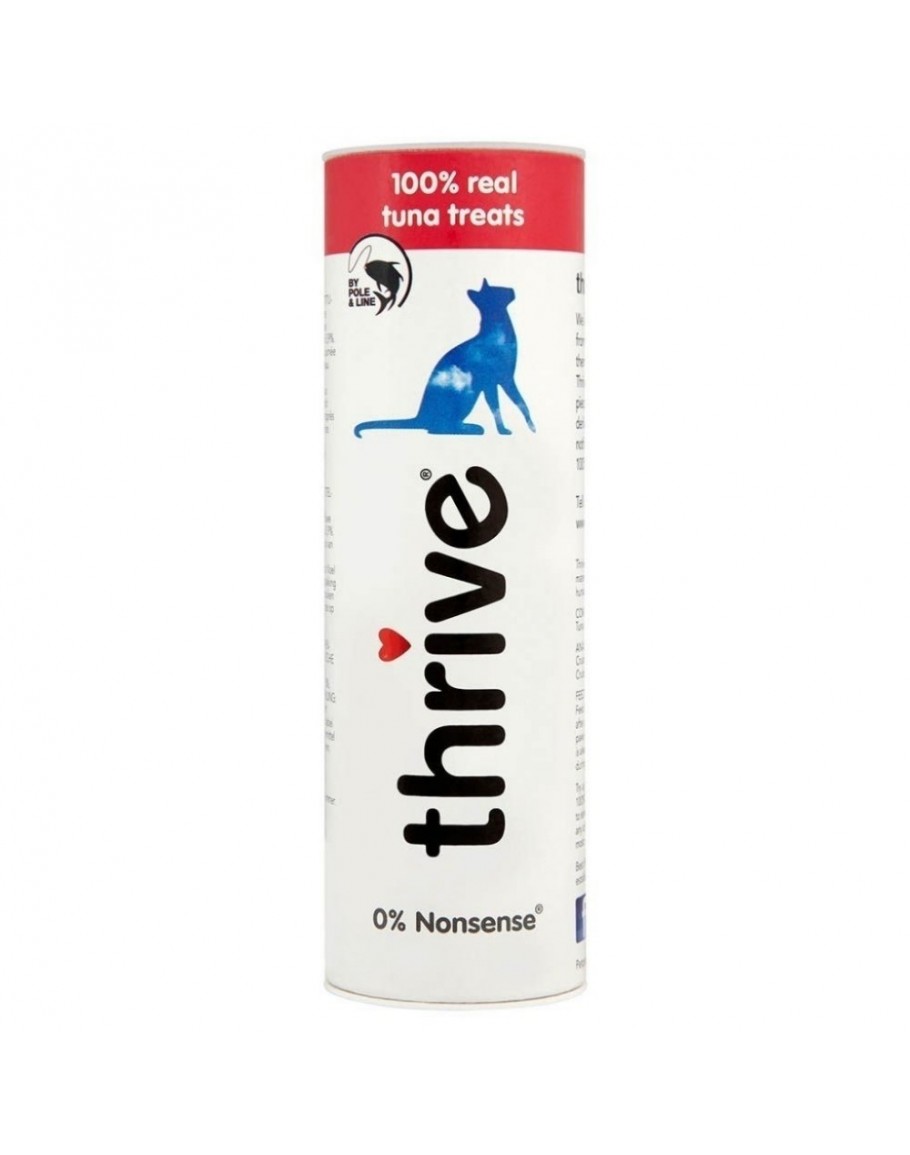 Thrive Godbitar Tonfisk 25 gThrive är ett kattgodis av 100% torkat tonfiskkött. Detta kattgodiset är skuret i lagom stora bitar och är ett utmärkt godis när du vill belöna din katt utan att ge den onyttigheter! Thrive kattgodis med tonfisk är förpackat i ett smidigt rör som går att återförsluta. Tänk på att katter ska ges godis med måtta och att det aldrig bör ersätta ett välbalanserat helfoder.