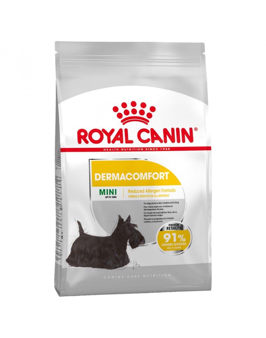 Irriterad hud är riktigt obehagligt, även för din hund. Visste du att hudproblem hos hundar är en av de vanligaste anledningarna till ett besök hos veterinären? Känslig, irriterad hud får din hund att klia sig ofta, och risken är stor att den skadar huden med klorna. Med den hudvänliga formulan i Royal Canin Dermacomfort Mini har man varit noga med att använda speciellt utvalda proteiner. Detta specialanpassade foder kan hjälpa till att hålla din hunds hud och päls i bästa möjliga skick. Produkten i korthet: Helfoder för små hundar Skräddarsytt för de speciella behov hundar med känslig, känslig hud har Högkvalitativa näringsämnen: kan bidra till en fyllig och frisk päls Utvalda proteinkällor: med reducerad allergiframkallande potential Omega-fettsyror: berikat med GLA, EPA och DHA för att vårda känslig hud 91 % nöjda ägare: övertygad av de påvisbara resultaten efter bara 2 månader Dieten för hundar med känslig hud finns som torrfoder i form av foderbitar eller som mousse i portionspåsar. De två produkterna kan kombineras med varandra. Torrfodret finns med foderbitar i flera storlekar eftersom det har utvecklats specifikt för behoven hos små, medelstora eller stora hundar i åtanke. Mer information om våtfodret hittar du under följande länk: Royal Canin Dermacomfort våtfoder