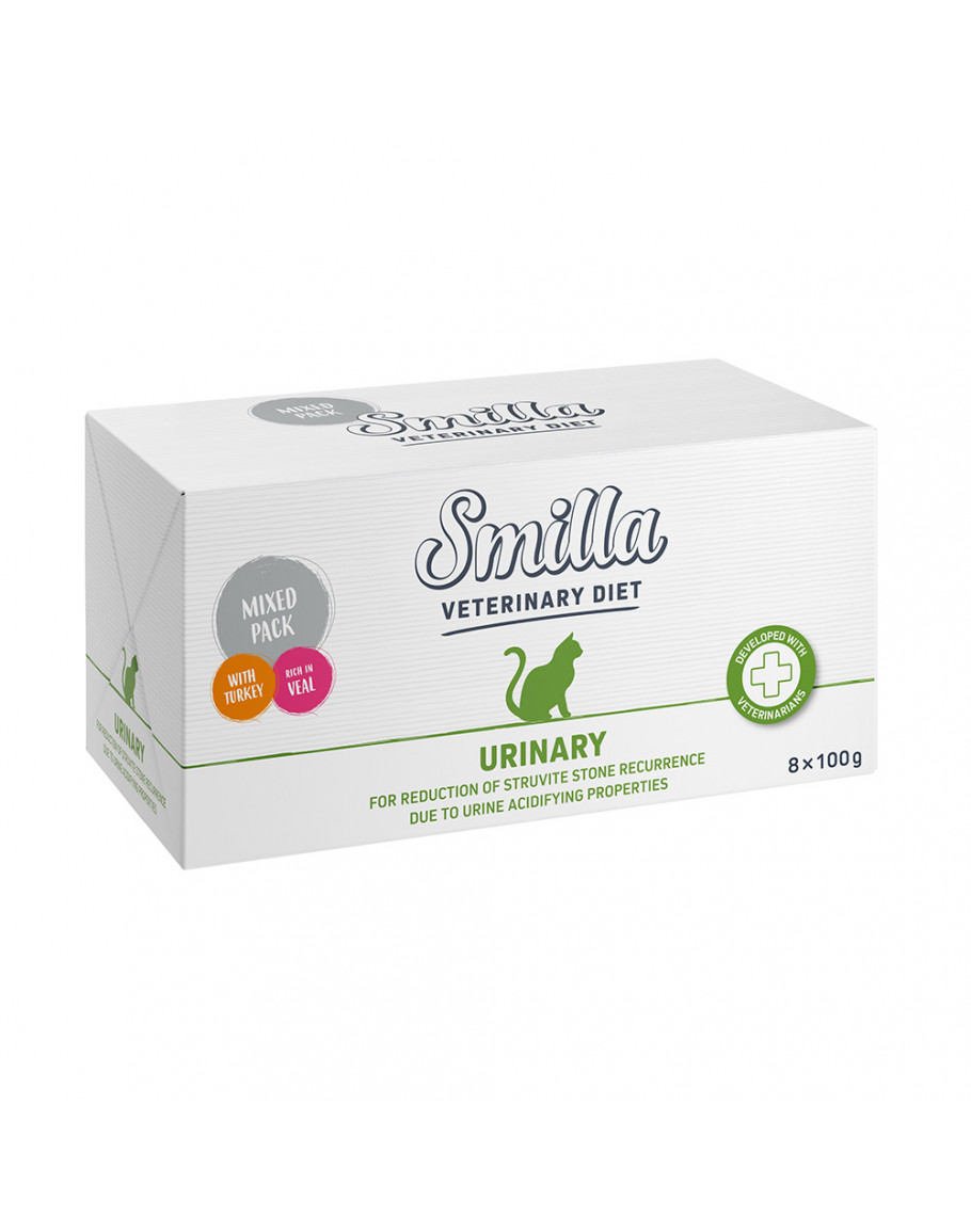 Smilla Veterinary Diet Urinary Smilla Veterinary Diet Urinary är ett komplett dietfoder speciellt utvecklat för katter med tendens till struvitstenar. Struvitstenar orsakas ofta av en koncentration av mineraler i urinen. Detta kan leda till inflammation i urinröret och urinblåsan. Därefter kan urinröret också blockeras hos hankatter, vilket leder till en medicinsk nödsituation. Symtomen är täta urinträngningar i små mängder, ibland med läten eller urinträngningar utanför kattlådan, orenlighet, blodig urin och ett ökat "behov av att rengöra" könsorganen. Det balanserade mineralförhållandet i detta foder gör att pH-värdet i urinen hamnar i det lätt sura området. Fodrets urinsyrande egenskaper kan bidra till att förhindra att ny struvit bildas. Receptet är spannmålsfritt. Smilla Veterinary Diet Urinary övertygar: Komplett dietfoder för vuxna katter med sjukdomar i de nedre urinvägarna För att minska återfall av struvitstenar Kombination av mineraler: för ett optimalt pH-värde i urinen Kostfiber: bidrar till en balanserad matsmältning och kan hjälpa dig att känna dig mätt Spannmålsfri sammansättning Innehåller inget tillsatt socker, soja eller konstgjorda tillsatser Smilla Veterinary Diet Renal Smilla Veterinary Diet Renal är ett komplett dietfoder för att stödja njurfunktionen hos katter med kronisk njurinsufficiens. Vid njurinsufficiens är njurens nefron oåterkalleligt skadade och de fortfarande intakta nefronen måste ta över funktionen. För att lindra detta är det viktigt att förse kroppen med lågt men mycket högkvalitativt protein , och ett lågt fosforinnehåll är också viktigt. Av denna anledning har protein- och fosforinnehållet i Smilla Veterinary Diet Renal minskats. De animaliska proteinkällor som ingår är dock tillräckliga för att täcka proteinbehovet. Detta foder innehåller också lättsmält potatis som en källa till kolhydrater. Receptet är spannmålsfritt. Smilla Veterinary Diet Renal är övertygande: Dietfoder för alla vuxna katter med njursjukdom/njurinsufficiens Reducerat protein- och fosforinnehåll för att avlasta njurarna Spannmålsfri sammansättning Med högkvalitativa proteiner för att täcka proteinbehovet Med potatis som en lättsmält kolhydratkälla Utan tillsatt socker Urinary mix-paketet innehåller 4 x med kalkon 4 x med kalv Renal mix-paketet innehåller 4 x med kyckling 4 x med nötkött Du hittar mer information om produkterna här: Smilla Veterinary Diet Urinary med kalkon Smilla Veterinary Diet Urinary med kalv Smilla Veterinary Diet Renal med kyckling Smilla Veterinary Diet Renal med nötkött